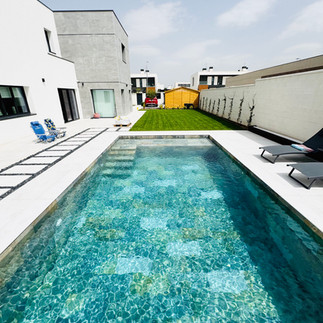 En este proyecto hemos tenido el privilegio de suministrar una selección de materiales de primera calidad, diseñados para aportar seguridad, estética y durabilidad tanto en el vaso de la piscina como en las zonas de exterior.